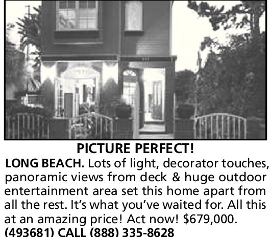 PICTURE PERFECT! LONG BEACH. Lots of light, decorator touches, panoramic views from deck & huge outdoor entertainment area set this home apart from all the rest. It’s what you’ve waited for. All this at an amazing price! Act now! $679,000. (493681) CALL (888) 335-8628
