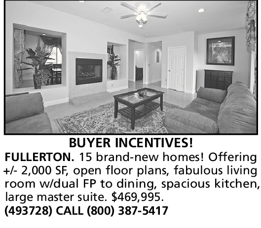 FULLERTON. 15 brand-new homes! Offering +/- 2,000 SF, open floor plans, fabulous living room w/dual FP to dining, spacious kitchen, large master suite. $469,995.