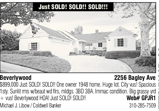 Just SOLD! SOLD!! SOLD!!! Beverlywood 2256 Bagley Ave $899,000 Just SOLD! SOLD!! One owner 1948 home. Huge lot. City vus! Spacious 1sty. Sunlit rms w/beaut wd flrs, mldgs. 3BD 3BA. Immac condition. Big grassy yrd + vus! Beverlywood HOA! Just SOLD! SOLD!! Web# GPJR1 Michael J. Libow / Coldwell Banker 310-285-7509 See also