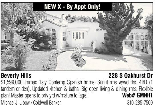 NEW X - By Appt Only! Beverly Hills 228 S Oakhurst Dr $1,599,000 Immac 1sty Contemp Spanish home. Sunlit rms w/wd flrs. 4BD (1 tandem or den). Updated kitchen & baths. Big open living & dining rms. Flexible plan! Master opens to priv yrd w/mature foliage. Web# GMNH1 Michael J. Libow / Coldwell Banker 310-285-7509