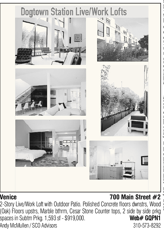 Venice 700 Main Street #2 2-Story Live/Work Loft with Outdoor Patio. Polished Concrete floors dwnstrs, Wood (Oak) Floors upstrs, Marble bthrm, Cesar Stone Counter tops, 2 side by side prkg spaces in Subtrn Prkg. 1,593 sf - $919,000. Web# GQPN1 Andy McMullen / SCO Advisors 310-573-8292