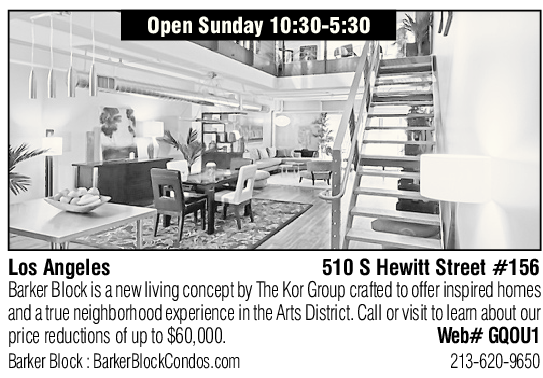 Open Sunday 10:30-5:30 Los Angeles 510 S Hewitt Street #156 Barker Block is a new living concept by The Kor Group crafted to offer inspired homes and a true neighborhood experience in the Arts District. Call or visit to learn about our price reductions of up to $60,000. Web# GQOU1 Barker Block : BarkerBlockCondos.com 213-620-9650 See also