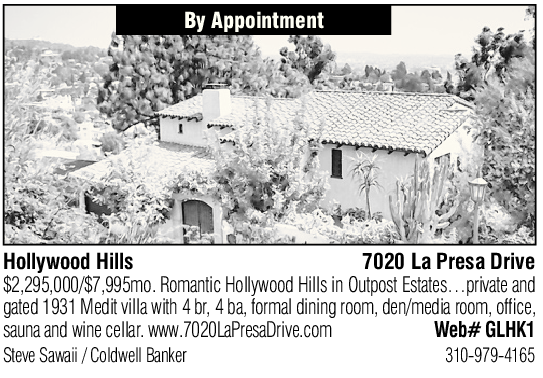 By Appointment Hollywood Hills 7020 La Presa Drive $2,295,000/$7,995mo. Romantic Hollywood Hills in Outpost Estates…private and gated 1931 Medit villa with 4 br, 4 ba, formal dining room, den/media room, office, sauna and wine cellar. www.7020LaPresaDrive.com Web# GLHK1 Steve Sawaii / Coldwell Banker 310-979-4165