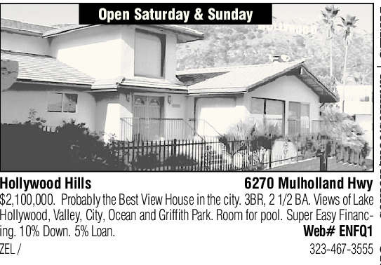 Open Saturday & Sunday Hollywood Hills 6270 Mulholland Hwy $2,100,000. Probably the Best View House in the city. 3BR, 2 1/2 BA. Views of Lake Hollywood, Valley, City, Ocean and Griffith Park. Room for pool. Super Easy Financing. 10% Down. 5% Loan. Web# ENFQ1 ZEL / 323-467-3555