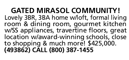 Lovely 3BR, 3BA home w/loft, formal living room & dining room, gourmet kitchen w/SS appliances, travertine floors, great location w/award-winning schools, close to shopping & much more! $425,000. (493862) CALL (800) 387-1455