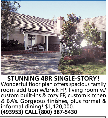 STUNNING 4BR SINGLE-STORY! Wonderful floor plan offers spacious family room addition w/brick FP, living room w/ custom built-ins & cozy FP, custom kitchen & BA’s. Gorgeous finishes, plus formal & informal dining! $1,120,000. (493953) CALL (800) 387-5430