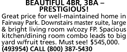 BEAUTIFUL 4BR, 3BA – PRESTIGIOUS! Great price for well-maintained home in Fairway Park. Downstairs master suite, large & bright living room w/cozy FP. Spacious kitchen/dining room combo leads to big yard w/fruit trees. Must see! $545,000. (493954) CALL (800) 387-5430