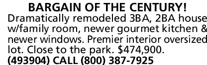 Dramatically remodeled 3BA, 2BA house w/family room, newer gourmet kitchen & newer windows. Premier interior oversized lot. Close to the park. $474,900. (493904) CALL (800) 387-7925