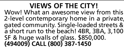 Wow! What an awesome view from this 2-level contemporary home in a private, gated community. Single-loaded streets & a short run to the beach! 4BR, 3BA, 3,100 SF & huge walls of glass. $850,000. (494009) CALL (800) 387-1450
