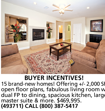 15 brand-new homes! Offering +/- 2,000 SF, open floor plans, fabulous living room w/ dual FP to dining, spacious kitchen, large master suite & more. $469,995. (493711) CALL (800) 387-5417