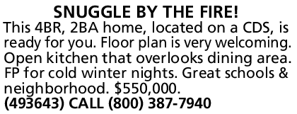 This 4BR, 2BA home, located on a CDS, is ready for you. Floor plan is very welcoming. Open kitchen that overlooks dining area. FP for cold winter nights. Great schools & neighborhood. $550,000. (493643) CALL (800) 387-7940
