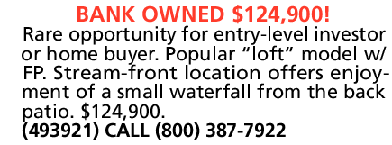 Rare opportunity for entry-level investor or home buyer. Popular “loft” model w/ FP. Stream-front location offers enjoyment of a small waterfall from the back patio. $124,900. (493921) CALL (800) 387-7922