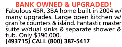 Fabulous 4BR, 3BA home built in 2004 w/ many upgrades. Large open kitchen w/ granite counters & island. Fantastic master suite w/dual sinks & separate shower & tub. Only $390,000. (493715) CALL (800) 387-5417