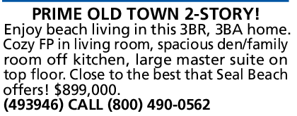 Enjoy beach living in this 3BR, 3BA home. Cozy FP in living room, spacious den/family room off kitchen, large master suite on top floor. Close to the best that Seal Beach offers! $899,000. (493946) CALL (800) 490-0562
