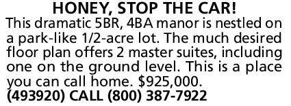 HONEY, STOP THE CAR! This dramatic 5BR, 4BA manor is nestled on a park-like 1/2-acre lot. The much desired floor plan offers 2 master suites, including one on the ground level. This is a place you can call home. $925,000. (493920) CALL (800) 387-7922