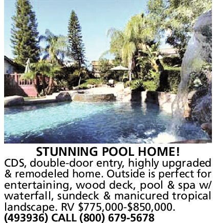 CDS, double-door entry, highly upgraded & remodeled home. Outside is perfect for entertaining, wood deck, pool & spa w/ waterfall, sundeck & manicured tropical landscape. RV $775,000-$850,000. (493936) CALL (800) 679-5678