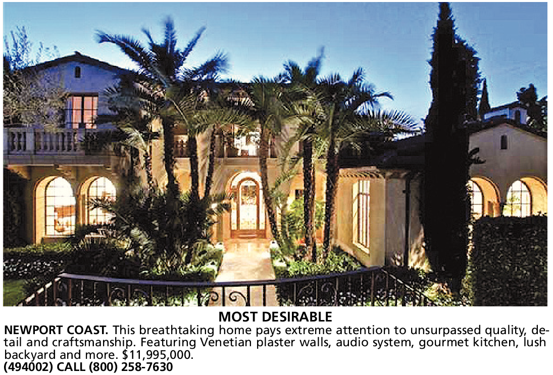 MOST DESIRABLE NEWPORT COAST. This breathtaking home pays extreme attention to unsurpassed quality, detail and craftsmanship. Featuring Venetian plaster walls, audio system, gourmet kitchen, lush backyard and more. $11,995,000. (494002) CALL (800) 258-7630