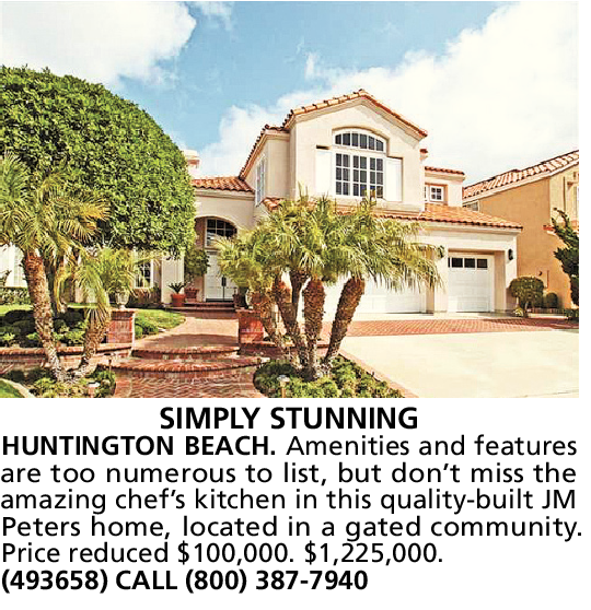 SIMPLY STUNNING HUNTINGTON BEACH. Amenities and features are too numerous to list, but don’t miss the amazing chef’s kitchen in this quality-built JM Peters home, located in a gated community. Price reduced $100,000. $1,225,000. (493658) CALL (800) 387-7940