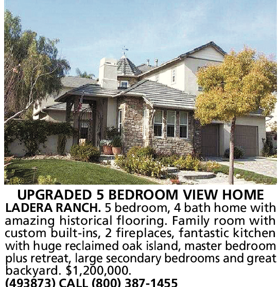 UPGRADED 5 BEDROOM VIEW HOME LADERA RANCH. 5 bedroom, 4 bath home with amazing historical flooring. Family room with custom built-ins, 2 fireplaces, fantastic kitchen with huge reclaimed oak island, master bedroom plus retreat, large secondary bedrooms and great backyard. $1,200,000. (493873) CALL (800) 387-1455