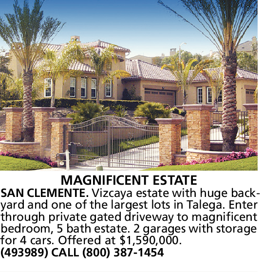 MAGNIFICENT ESTATE SAN CLEMENTE. Vizcaya estate with huge backyard and one of the largest lots in Talega. Enter through private gated driveway to magnificent bedroom, 5 bath estate. 2 garages with storage for 4 cars. Offered at $1,590,000. (493989) CALL (800) 387-1454