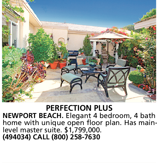 PERFECTION PLUS NEWPORT BEACH. Elegant 4 bedroom, 4 bath home with unique open floor plan. Has mainlevel master suite. $1,799,000.