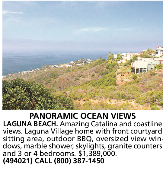 PANORAMIC OCEAN VIEWS LAGUNA BEACH. Amazing Catalina and coastline views. Laguna Village home with front courtyard sitting area, outdoor BBQ, oversized view windows, marble shower, skylights, granite counters and 3 or 4 bedrooms. $1,389,000. (494021) CALL (800) 387-1450