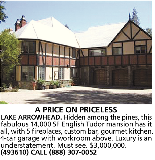A PRICE ON PRICELESS LAKE ARROWHEAD. Hidden among the pines, this fabulous 14,000 SF English Tudor mansion has it all, with 5 fireplaces, custom bar, gourmet kitchen. 4-car garage with workroom above. Luxury is an understatement. Must see. $3,000,000. (493610) CALL (888) 307-0052