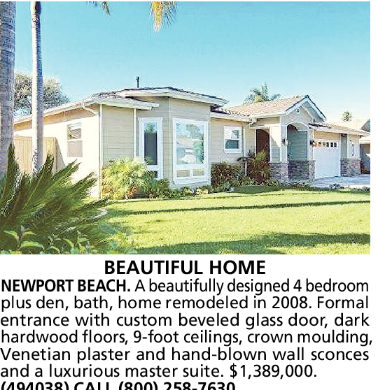 BEAUTIFUL HOME NEWPORT BEACH. A beautifully designed 4 bedroom plus den, bath, home remodeled in 2008. Formal entrance with custom beveled glass door, dark hardwood floors, 9-foot ceilings, crown moulding, Venetian plaster and hand-blown wall sconces and a luxurious master suite. $1,389,000.