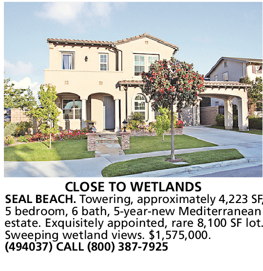 CLOSE TO WETLANDS SEAL BEACH. Towering, approximately 4,223 SF, 5 bedroom, 6 bath, 5-year-new Mediterranean estate. Exquisitely appointed, rare 8,100 SF lot. Sweeping wetland views. $1,575,000. (494037) CALL (800) 387-7925