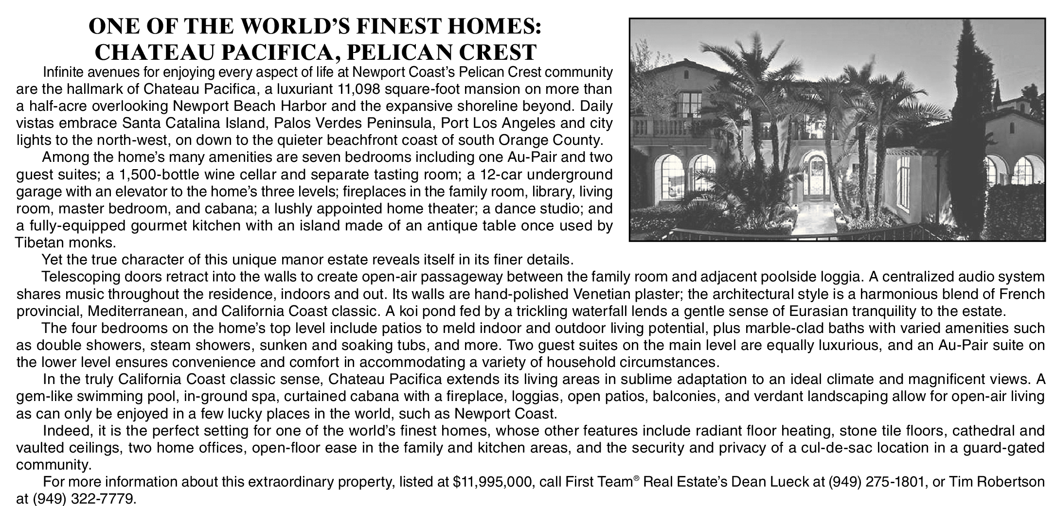 For more information about this extraordinary property, listed at $11,995,000, call First Team ® Real Estate’s Dean Lueck at (949) 275-1801, or Tim Robertson at (949) 322-7779.
