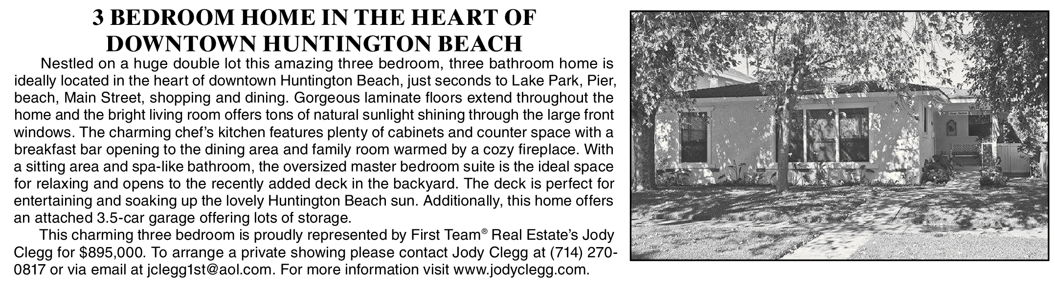 3 BEDROOM HOME IN THE HEART OF DOWNTOWN HUNTINGTON BEACH Nestled on a huge double lot this amazing three bedroom, three bathroom home is ideally located in the heart of downtown Huntington Beach, just seconds to Lake Park, Pier, beach, Main Street, shopping and dining. Gorgeous laminate floors extend throughout the home and the bright living room offers tons of natural sunlight shining through the large front windows. The charming chef’s kitchen features plenty of cabinets and counter space with a breakfast bar opening to the dining area and family room warmed by a cozy fi replace. With a sitting area and spa-like bathroom, the oversized master bedroom suite is the ideal space for relaxing and opens to the recently added deck in the backyard. The deck is perfect for entertaining and soaking up the lovely Huntington Beach sun. Additionally, this home offers an attached 3.5-car garage offering lots of storage. This charming three bedroom is proudly represented by First Team ® Real Estate’s Jody Clegg for $895,000. To arrange a private showing please contact Jody Clegg at (714) 270- 0817 or via email at jclegg1st@aol.com. For more information visit www.jodyclegg.com.