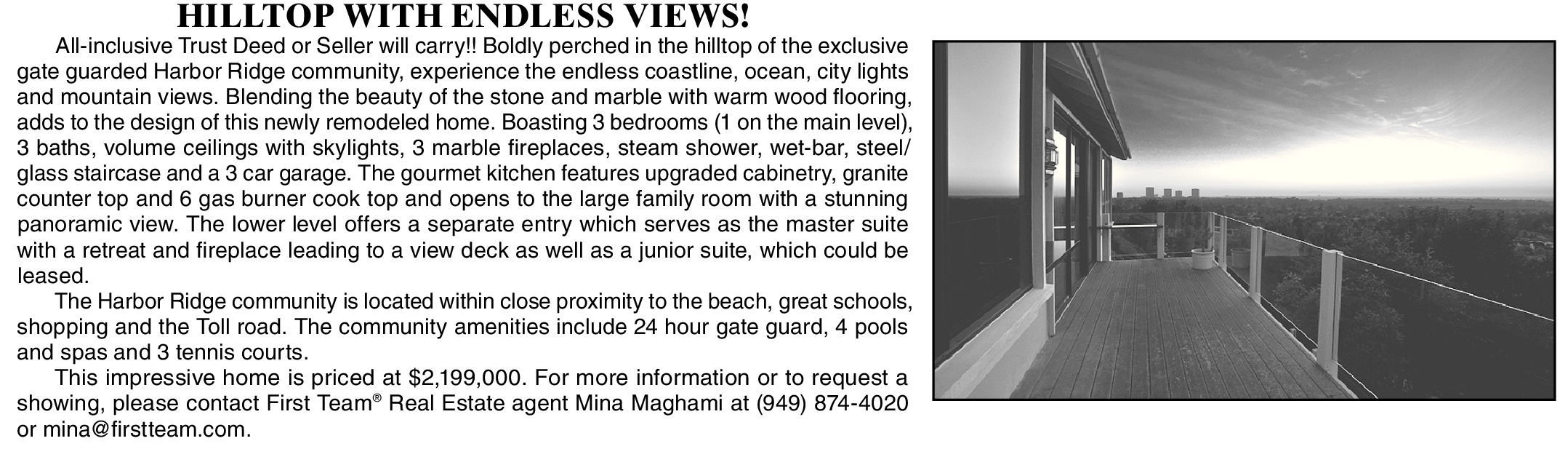 This impressive home is priced at $2,199,000. For more information or to request a showing, please contact First Team ® Real Estate agent Mina Maghami at (949) 874-4020 or mina@fi rstteam.com.