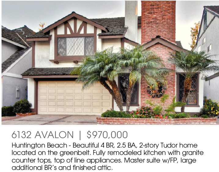 6132 AVALON | $970,000 Huntington Beach - Beautiful 4 BR, 2.5 BA, 2-story Tudor home located on the greenbelt. Fully remodeled kitchen with granite counter tops, top of line appliances. Master suite w/FP, large additional BR’s and finished attic.