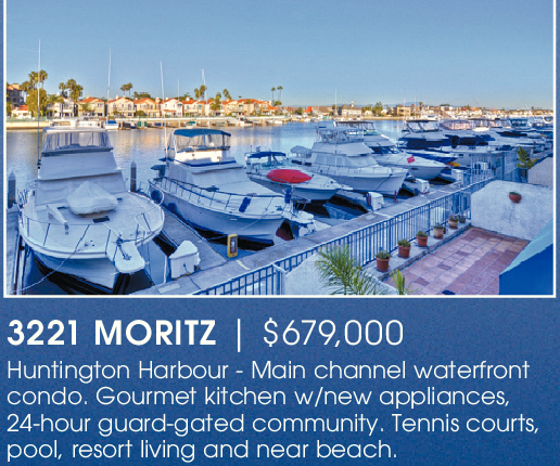 3221 MORITZ | $679,000 Huntington Harbour - Main channel waterfront condo. Gourmet kitchen w/new appliances, 24-hour guard-gated community. Tennis courts, pool, resort living and near beach.