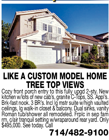 LIKE A CUSTOM MODEL HOME TREE TOP VIEWS Cozy front porch entry to this fully upgd 2-sty. New kitchen w/lots of new cab’s, granite C-Tops, SS. Appl’s. Brk-fast nook. 3 BR’s. Incl lg mstr suite w/high vaulted ceilings, lg walk-in closet & balcony. Dual sinks, vanity Roman tub/shower all remodeled. Frplc in sep fam rm, c/air tranquil setting w/wraparound rear yard. Only $495,000. See today. Call 714/482-9100
