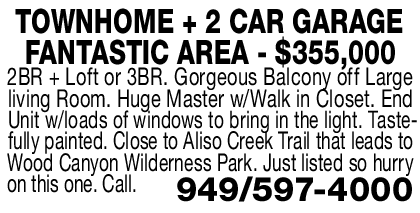 TOWNHOME + 2 CAR GARAGE FANTASTIC AREA - $355,000 2BR + Loft or 3BR. Gorgeous Balcony off Large living Room. Huge Master w/Walk in Closet. End Unit w/loads of windows to bring in the light. Tastefully painted. Close to Aliso Creek Trail that leads to Wood Canyon Wilderness Park. Just listed so hurry on this one. Call. 949/597-4000