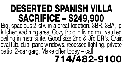 DESERTED SPANISH VILLA SACRIFICE – $249,900 Big, spacious 2-sty. in a great location. 3BR, 3BA, lg kitchen w/dining area. Cozy frplc in living rm., vaulted ceiling in mstr suite. Good size 2nd & 3rd BR’s. C/air, oval tub, dual-pane windows, recessed lighting, private patio, 2-car garg. Make offer today – call 714/482-9100