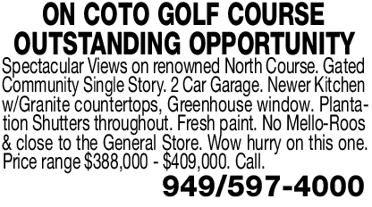 ON COTO GOLF COURSE OUTSTANDING OPPORTUNITY Spectacular Views on renowned North Course. Gated Community Single Story. 2 Car Garage. Newer Kitchen w/Granite countertops, Greenhouse window. Plantation Shutters throughout. Fresh paint. No Mello-Roos & close to the General Store. Wow hurry on this one. Price range $388,000 - $409,000. Call.