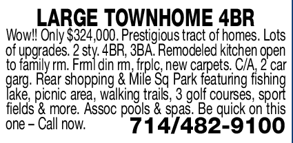 LARGE TOWNHOME 4BR Wow!! Only $324,000. Prestigious tract of homes. Lots of upgrades. 2 sty. 4BR, 3BA. Remodeled kitchen open to family rm. Frml din rm, frplc, new carpets. C/A, 2 car garg. Rear shopping & Mile Sq Park featuring fishing lake, picnic area, walking trails, 3 golf courses, sport fields & more. Assoc pools & spas. Be quick on this one – Call now. 714/482-9100