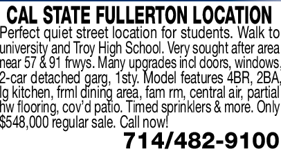 CAL STATE FULLERTON LOCATION Perfect quiet street location for students. Walk to university and Troy High School. Very sought after area near 57 & 91 frwys. Many upgrades incl doors, windows, 2-car detached garg, 1sty. Model features 4BR, 2BA, lg kitchen, frml dining area, fam rm, central air, partial hw flooring, cov’d patio. Timed sprinklers & more. Only $548,000 regular sale. Call now!