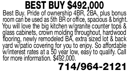 BEST BUY $492,000 Best Buy. Pride of ownership 4BR, 2BA, plus bonus room can be used as 5th BR or office, spacious & bright. You will love the big kitchen w/granite counter tops & glass cabinets, crown molding throughout, hardwood flooring, newly remodeled BA, extra sized lot & back yard w/patio covering for you to enjoy. So affordable w/interest rates at a 50 year low, easy to qualify. Call for more information. $492,000.