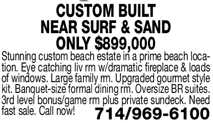 CUSTOM BUILT NEAR SURF & SAND ONLY $899,000 Stunning custom beach estate in a prime beach location. Eye catching liv rm w/dramatic fireplace & loads of windows. Large family rm. Upgraded gourmet style kit. Banquet-size formal dining rm. Oversize BR suites. 3rd level bonus/game rm plus private sundeck. Need fast sale. Call now! 714/969-6100
