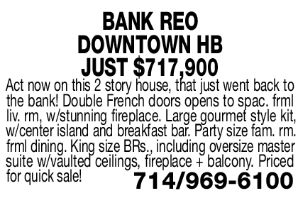 BANK REO DOWNTOWN HB JUST $717,900 Act now on this 2 story house, that just went back to the bank! Double French doors opens to spac. frml liv. rm, w/stunning fireplace. Large gourmet style kit, w/center island and breakfast bar. Party size fam. rm. frml dining. King size BRs., including oversize master suite w/vaulted ceilings, fireplace + balcony. Priced for quick sale! 714/969-6100