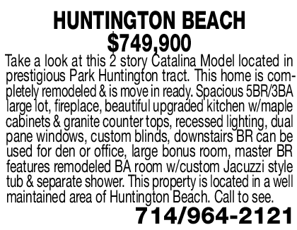 HUNTINGTON BEACH $749,900 Take a look at this 2 story Catalina Model located in prestigious Park Huntington tract. This home is completely remodeled & is move in ready. Spacious 5BR/3BA large lot, fireplace, beautiful upgraded kitchen w/maple cabinets & granite counter tops, recessed lighting, dual pane windows, custom blinds, downstairs BR can be used for den or office, large bonus room, master BR features remodeled BA room w/custom Jacuzzi style tub & separate shower. This property is located in a well maintained area of Huntington Beach. Call to see.