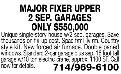 MAJOR FIXER UPPER 2 SEP. GARAGES ONLY $550,000 Unique single-story house w/2 sep. garages. Save thousands on fix-up cost. Spac frml liv rm. Country style kit. New forced air furnace. Double paned windows. Standard 2-car garage plus sep. 16 foot tall garage w/10 ton electric crane, approx. 1100 SF. Call now for details. 714/969-6100