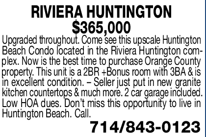 RIVIERA HUNTINGTON $365,000 Upgraded throughout. Come see this upscale Huntington Beach Condo located in the Riviera Huntington complex. Now is the best time to purchase Orange County property. This unit is a 2BR +Bonus room with 3BA & is in excellent condition. – Seller just put in new granite kitchen countertops & much more. 2 car garage included. Low HOA dues. Don’t miss this opportunity to live in Huntington Beach. Call. 714/843-0123 See also