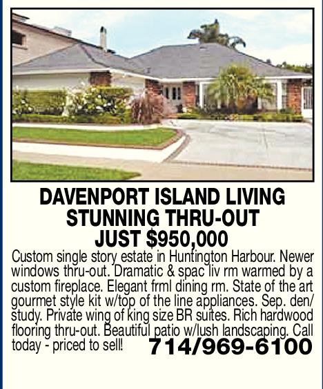 DAVENPORT ISLAND LIVING STUNNING THRU-OUT JUST $950,000 Custom single story estate in Huntington Harbour. Newer windows thru-out. Dramatic & spac liv rm warmed by a custom fireplace. Elegant frml dining rm. State of the art gourmet style kit w/top of the line appliances. Sep. den/ study. Private wing of king size BR suites. Rich hardwood flooring thru-out. Beautiful patio w/lush landscaping. Call today - priced to sell! 714/969-6100