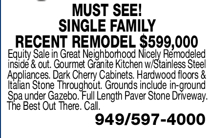 SINGLE FAMILY RECENT REMODEL $599,000 Equity Sale in Great Neighborhood Nicely Remodeled inside & out. Gourmet Granite Kitchen w/Stainless Steel Appliances. Dark Cherry Cabinets. Hardwood floors & Italian Stone Throughout. Grounds include in-ground Spa under Gazebo. Full Length Paver Stone Driveway.