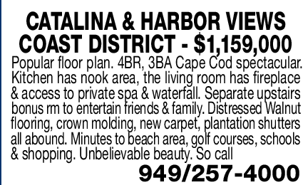 CATALINA & HARBOR VIEWS COAST DISTRICT - $1,159,000 Popular floor plan. 4BR, 3BA Cape Cod spectacular. Kitchen has nook area, the living room has fireplace & access to private spa & waterfall. Separate upstairs bonus rm to entertain friends & family. Distressed Walnut flooring, crown molding, new carpet, plantation shutters all abound. Minutes to beach area, golf courses, schools & shopping. Unbelievable beauty. So call 949/257-4000
