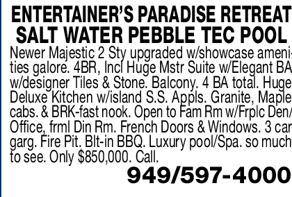 ENTERTAINER’S PARADISE RETREAT SALT WATER PEBBLE TEC POOL Newer Majestic 2 Sty upgraded w/showcase amenities galore. 4BR, Incl Huge Mstr Suite w/Elegant BA w/designer Tiles & Stone. Balcony. 4 BA total. Huge Deluxe Kitchen w/island S.S. Appls. Granite, Maple cabs. & BRK-fast nook. Open to Fam Rm w/Frplc Den/ Office, frml Din Rm. French Doors & Windows. 3 car. garg. Fire Pit. Blt-in BBQ. Luxury pool/Spa. so much to see. Only $850,000. Call. 949/597-4000 See also